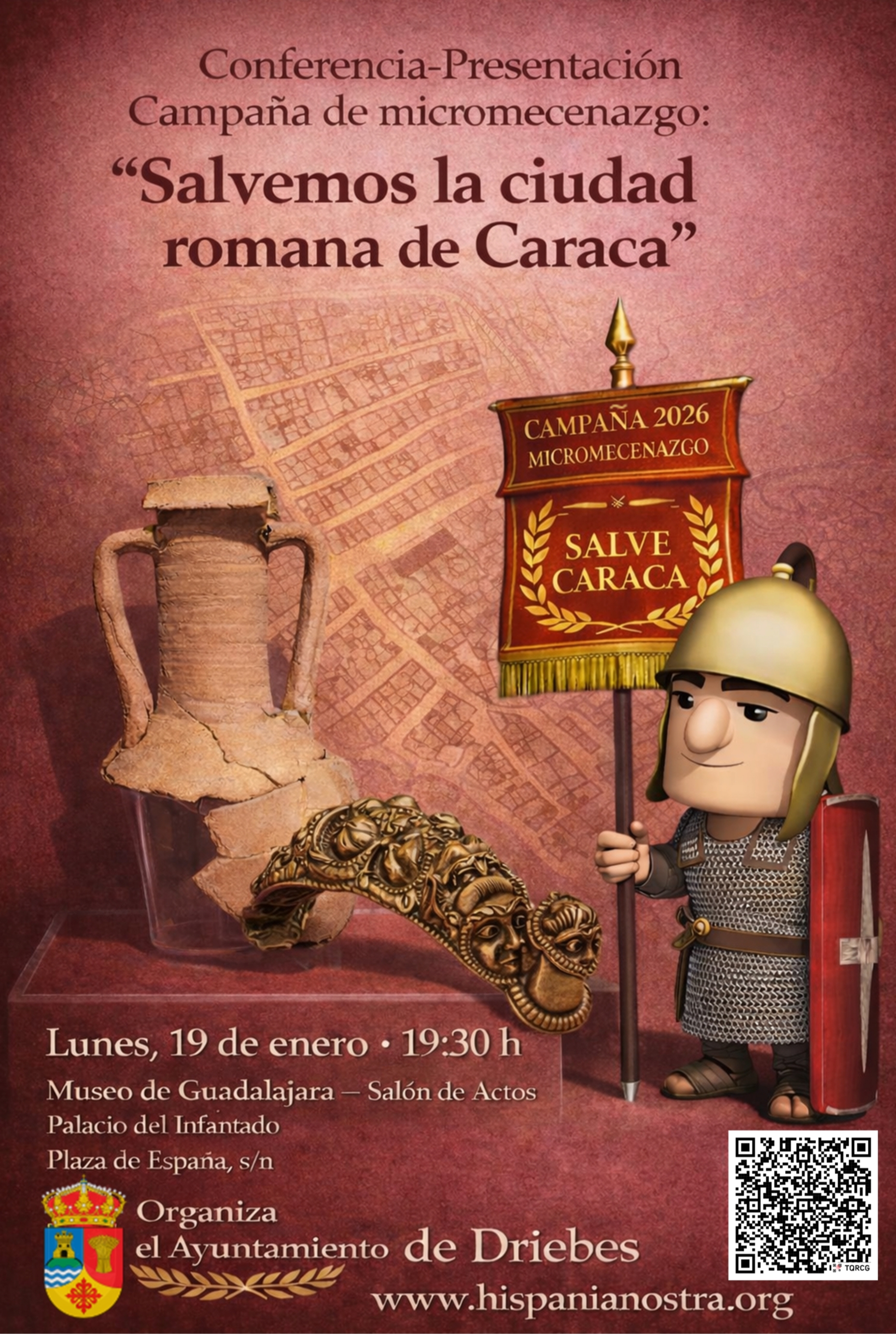 Se trata de la presentación de la campaña de micromecenazgo “Salvemos la ciudad romana de Caraca”. Desde hace nueve años se están realizando excavaciones arqueológicas en este yacimiento ubicado en la localidad de Driebes, demostrando que esta ciudad perdida es, sin duda, un yacimiento fascinante. Sin embargo, ahora atraviesa un momento crítico, pues el Ayuntamiento de Driebes necesita expropiar los terrenos para poder continuar las excavaciones en este yacimiento arqueológico del Cerro de la Virgen de la Muela, garantizando así su conservación, protección y difusión, para lo que es necesario que las tierras donde se ubican los restos arqueológicos más destacados pasen a propiedad municipal. Esto implica un desembolso económico que un Ayuntamiento con 331 habitantes no puede costear en solitario.